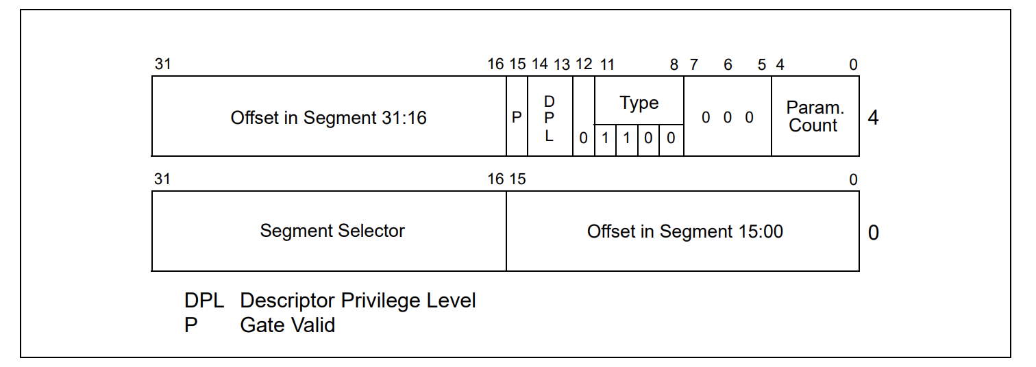 - Gate-Type (‘0x4’ means a 16-bit call-gate, ‘0xC’ means a 32-bit call-gate)